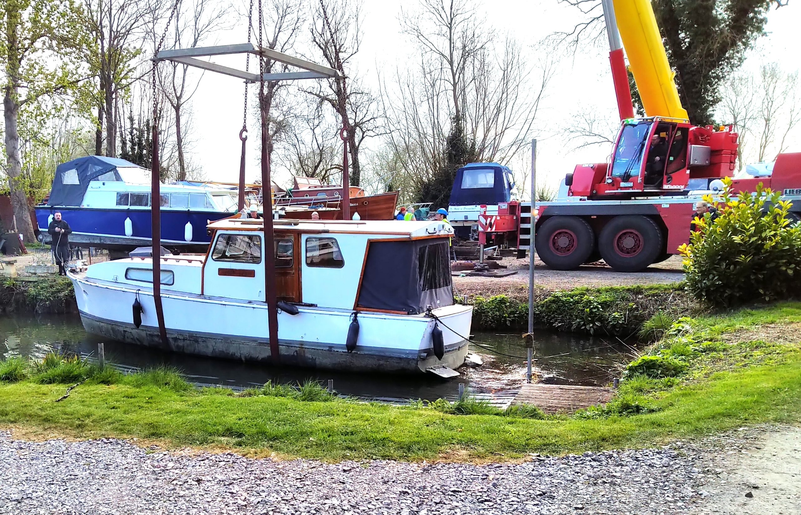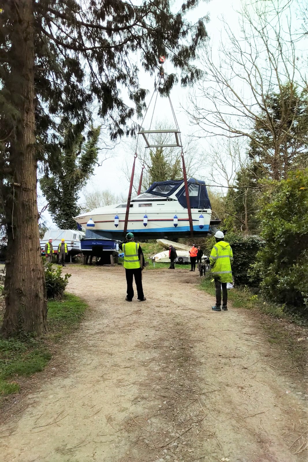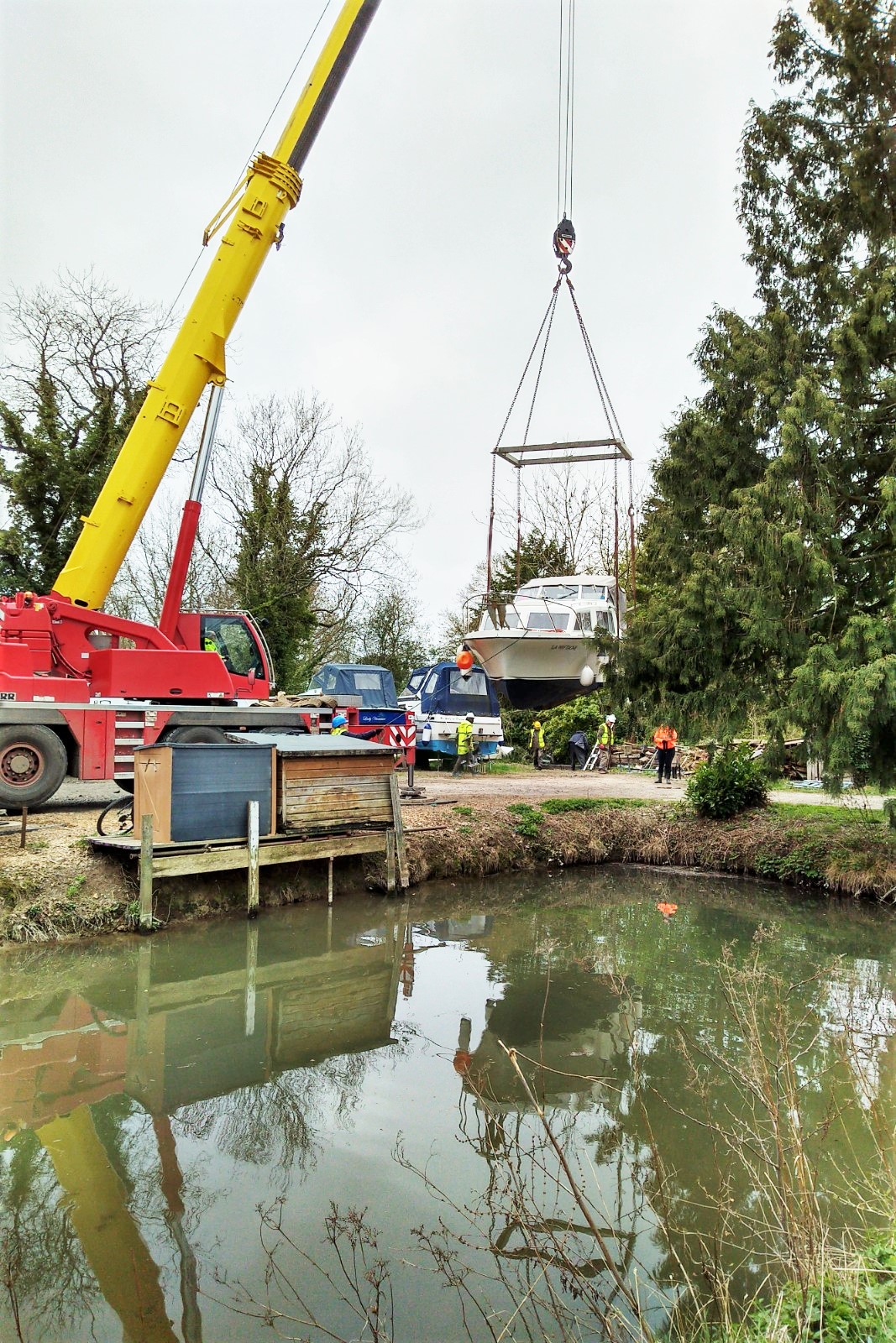 The craning operation took place on a bitterly cold but thankfully dry Saturday at the start of April, with the team from MJT Crane Hire Ltd once again on site. Barry Tuckey and his two ‘banks-women’ – his daughter, Lisa, and regular assistant, Sharon – arrived with their 60-tonne crane just before 9am and, with the help of some of the boat owners, all 10 cruisers were safely transferred to their berths in just two and a half hours.